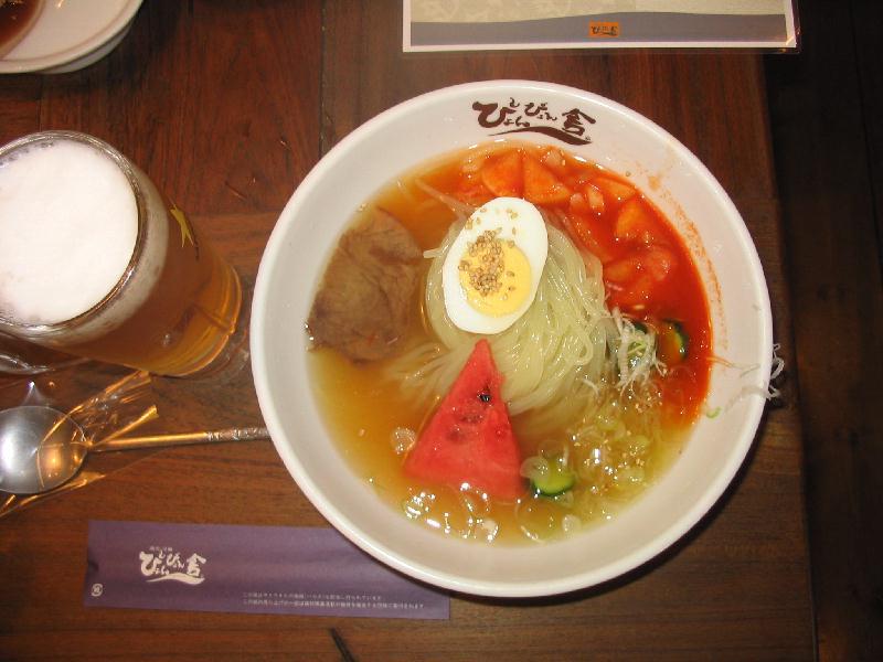 麺はコシがあり喉ごしがよく、やや甘めのスープとピリリとしたキムチの辛味が絶妙のコンビネーション。キムチは冷麺向きに少し香りよく作ってあったようです。
