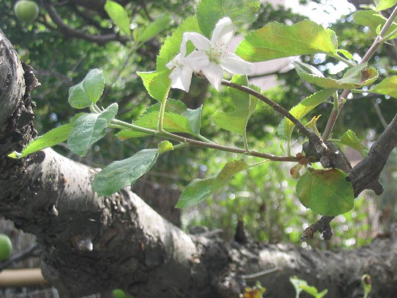 といってもワタクシのことではありません、このりんごの花のことですよ。盛岡で宮沢賢治ゆかりの民芸品店に立ち寄ったときのこと、中庭にあるりんごの木に目をやると、たわわに実るりんごの実の傍らにひっそりと健気に咲いてるではありませんか?