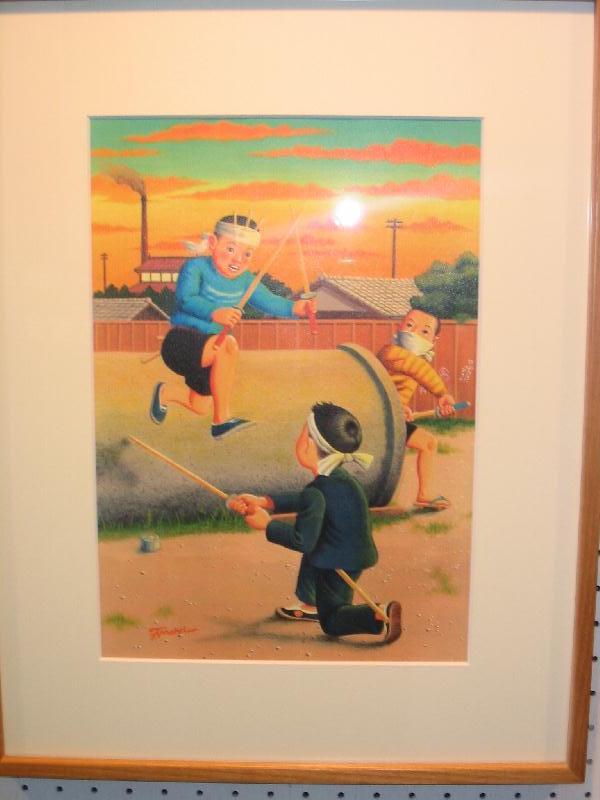 昨日のレトロ展のつづき、なつかしい昭和の風景絵画展をやっていました。子供たちがチャンバラごっこで遊んでいるシーンですが、実に当時の状況を細かく描写しているのには感心しました。