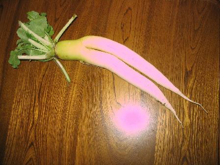 冬タイヤ履きOK、雪囲いOK、でも財布の中身はさぶぃ〜w。このほど市民農園の冬じまいのため、野菜を収穫したところ、ごらんのようなセクシー大根が取れました。