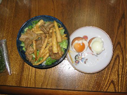 材料は黒豚というわけにいきませんでしたが気分は黒豚使用、まあまあイケテました。ただ、丼にふっくらとのせるはずの温泉卵がゆで卵になってしまったのが大失敗!採点は50点といったところでしょうか。
