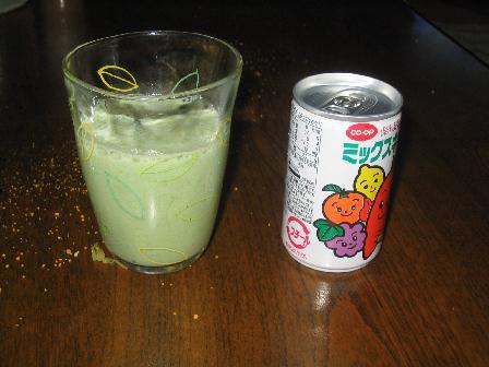 昼はミックスジュース。ほかにサプリメントとしてにんにく卵黄(スタミナ対策)とウコン錠剤(酒飲み対策)効果のほどはわかりませんが、健康オタクの自己満足かな?