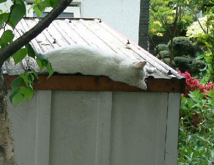 うちに餌だけ食いに来る近所のシロちゃん、物置小屋の屋根で気持ちよさそうに昼寝です。ですが、寝相があまりよろしくないようで体が半分落ちかかってます。これが落ちそうで落ちないビミョーな位置関係…最後どうなったか確認してませんが…。