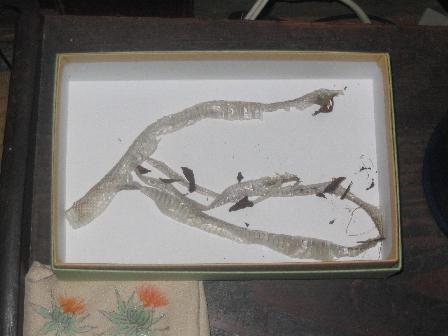 ネコの額ほど小さな拙宅の庭ですが、つい先日蛇の抜け殻を発見!