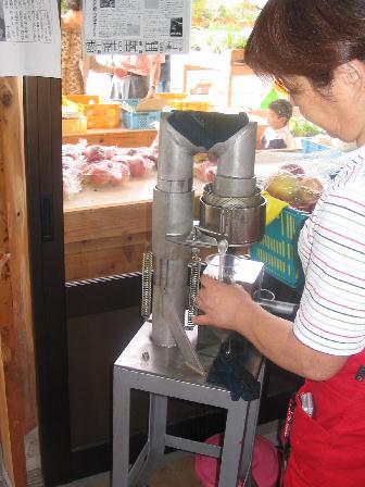 担当のおばさんの話によると、1日200個をシャカシャカと手動作業で絞るため、手が痛くなるとか…そのせいでしょうか、無愛想に答えてくれましたw。