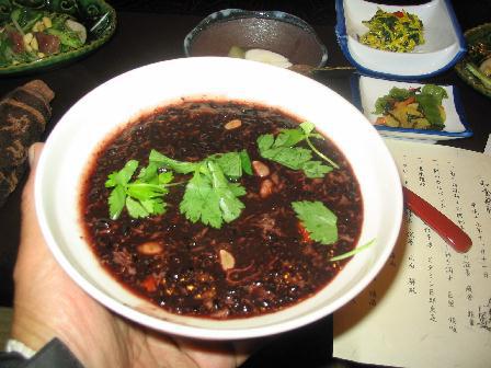 予約なしでもいただけるそうで、菊の胡麻和えや鮪カルパッチョ、黒米雑炊など計6品のコースで1000円ナリ。メインは黒米を鳥骨鶏のスープで煮込んだ雑炊ですが、見た目はコテコテですがとてもあっさりしてグッドです。胃に負担かからないので、何杯でもイケます。(お代わり自由)