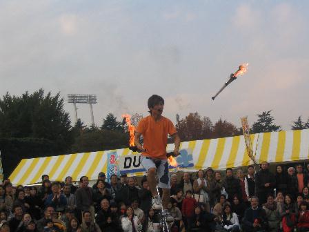 祭りでは特に大道芸人のパフォーマンスに人が群がっていましたが、この一輪車に乗りながらの観客から1本づつ受けてのタイマツ回しは見事でした。