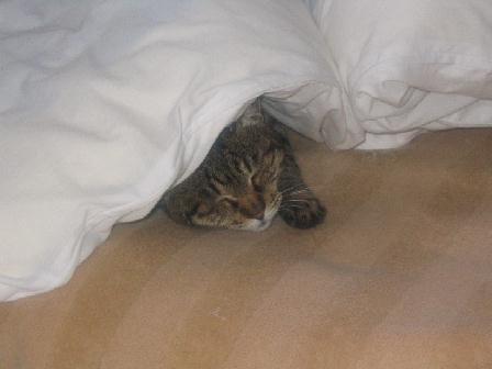 「春眠暁を覚えず」こんな言葉がぴったりの昨今、せがれは出勤間際まで惰眠をむさぼり、したがって万年床です。そこで毎朝せがれと交代して布団に入るちゃっかりネコ、快適スポットがどこか本能的にわかるんですねえ。眠ってるか食うか…私はネコになりた〜い。