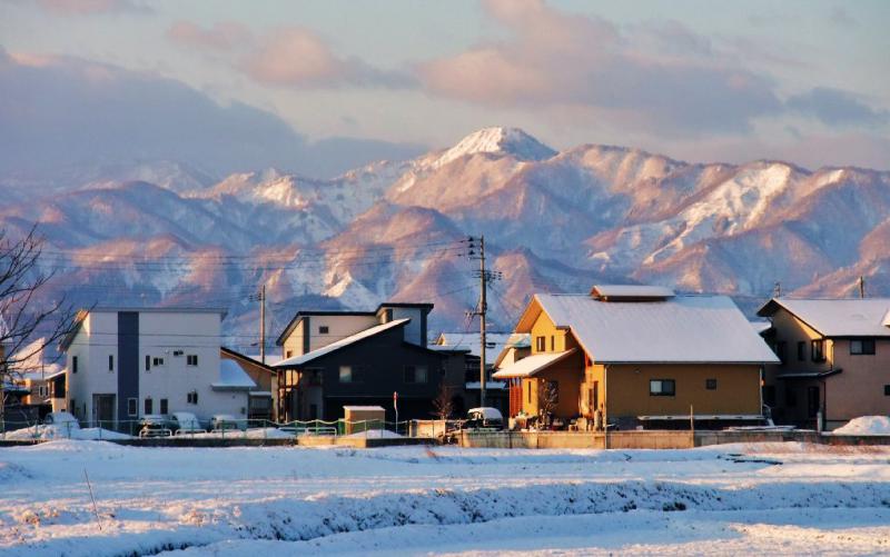 今朝の米沢、薄らと雪景色に朝日があたり見事な景色