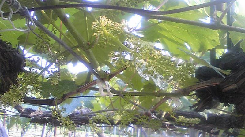 お隣高畠町のブドウ農家の圃場を視察してきました。画像は白ワイン用高級ブドウ品種のシャルドネの花です。よくブドウの花は線香花火みたいと言われます。