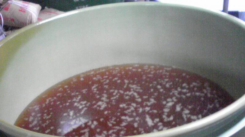 仕込みをした次の日は、朝早く起きて、前日仕込んだタンクから、一晩静置した上澄み部分のきれいな果汁を仕込みタンクに移し、澱部分を酒袋で濾して、酵母を一日培養した酒母(しゅぼ)を仕込みタンクに添加します。そうすっと、しばらくすると発酵が始まります。発酵すねごとにはワインさなんねがら、発酵を確認すっと一安心。