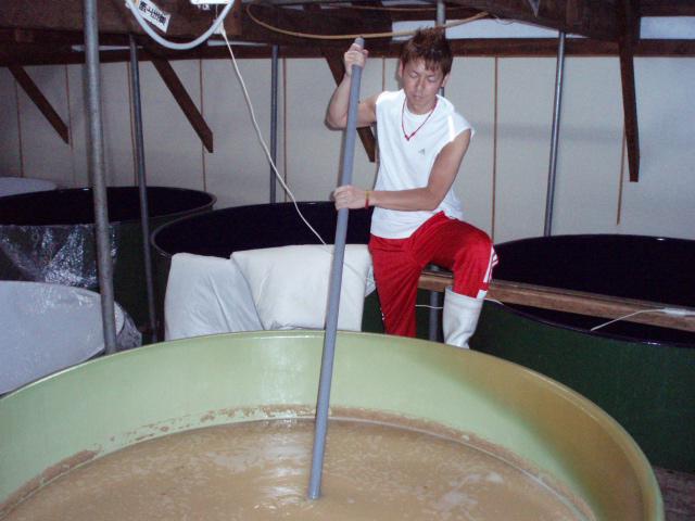画像は、発酵を止めるSO2を添加し、櫂を入れてるところです。『赤湯ヌーヴォー2008』になるタンクだっし。
