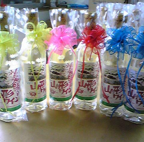 今日は女子社員で、注文頂いている結婚式用のワインの準備をしました。式が終わって新郎新婦がお見送りの時に渡す、プチギフト用のワインです。ハーフワインをめんごくラッピングして。