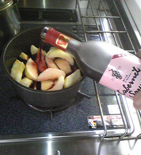 今が旬のラ・フランスを皮をむき、4つ切りにしたものを鍋さ入れて、甘さ調整のため砂糖やラ・フランスジュースを少々加えて、おらいの赤ワインの『カベルネ・ソーヴィニヨン』で煮ました。赤くワインの色がついたら、冷蔵庫で冷して出来上がり。