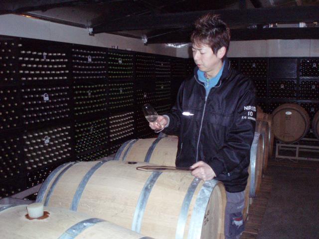 今現在、樽で熟成してる甲州種の白ワインがあります。まだ樽さ入れたばっかりなので、風味はまだまだ若いげんと、これから数ヶ月熟成を経て、旨いワインさ仕上げたいと思います。ベースになっている2008年産の甲州種のワインは、実に凛としているので、樽の力でもっと深みを出したいです。