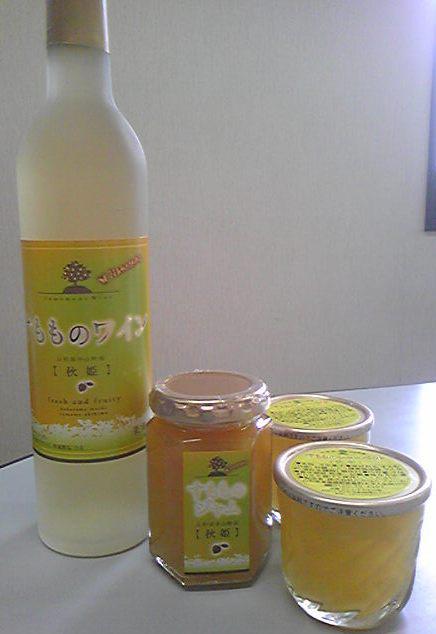 画像は、すももの『秋姫』という品種の、3点セット(ワイン、ジャム、シャーベット)。どれも、高級品種の『秋姫』だけを使用した、まろやかな甘さが特徴の加工品です。