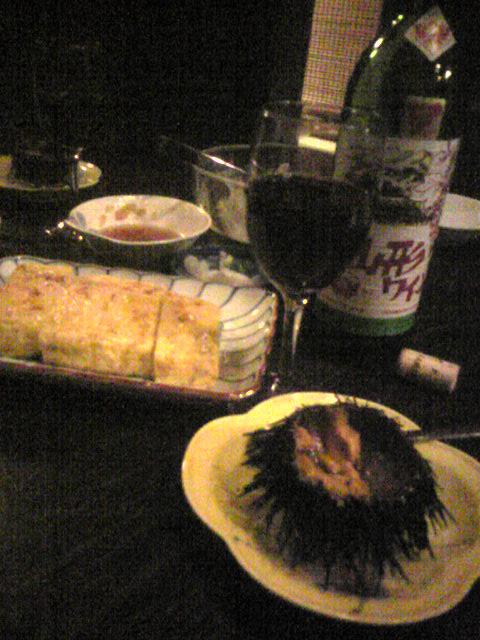 おらいの『山形ワイン・赤』をボトルで使って頂いてます。一般的に赤ワインは肉さ合うって言うげんと、このワインはライトボディということで、軽〜く冷して白ワイン感覚でも飲めるので、魚料理さ合います(生ウニ食ったげんとけっこう合うっけ)。