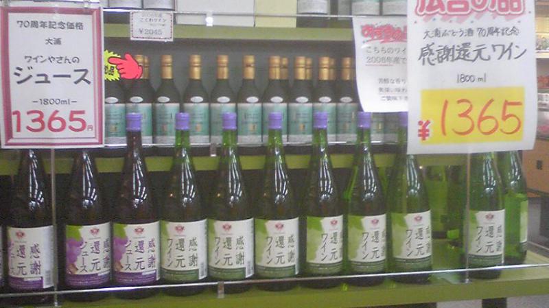 催事は今日で終わりだげんと、酒コーナーではおらいの70周年記念商品『感謝還元ワイン』と『感謝還元ジュース』を引き続き販売しております。一升瓶でかなりお得な価格(¥1,365)。ジュースの方が、少々品薄になってきました。お早めにどうぞっし(>_<)