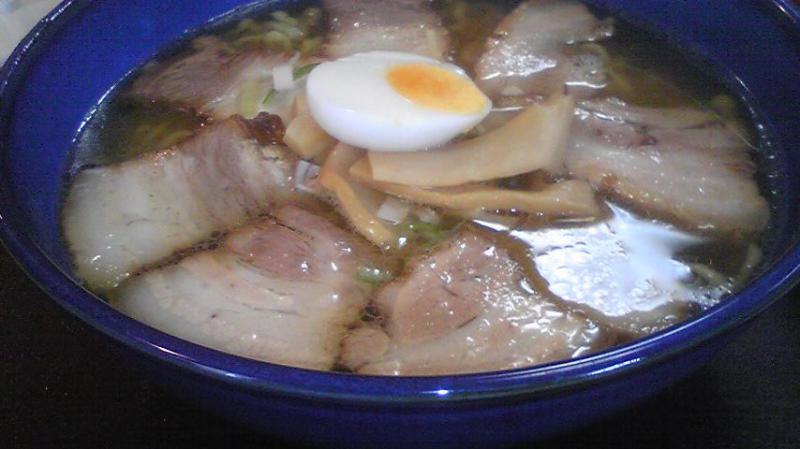 腹減ってだっけがら、塩チャーシューメンを注文。かなりモチっとした食感の麺で、スープは魚介系のだしがきき旨味たっぷり。塩にしては濃厚なスープ。チャーシューもモチっとした豚バラで旨いっけ。
