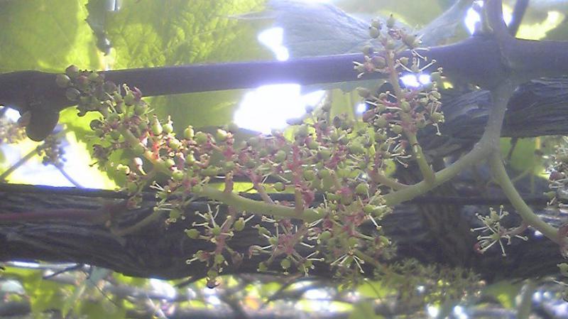 長年おらいの醸造用ぶどう品種を造って頂いている、武田さん(高畠町小郡山)の現在のベリー・アリカントAの状況だっし。このベリー・アリカントAは豊富なポリフェノールを持つ品種で、果肉まで真っ赤っ赤だっし。花が咲き、幼実も若干赤くなり、その面影が出始めった頃です。9月上旬収穫予定なので、あと約2ヶ月半すると、ワインに仕込みます。