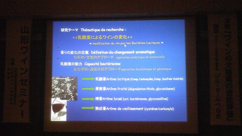今日は午後から、山形グランドホテルにて、ボルドー大学醸造学部のルベル教授を招いて、ワイナリー関係者、酒類流通業者、県の機関の方々対象のワインセミナーがありました。約50人近く集まったんでねぇべが。
