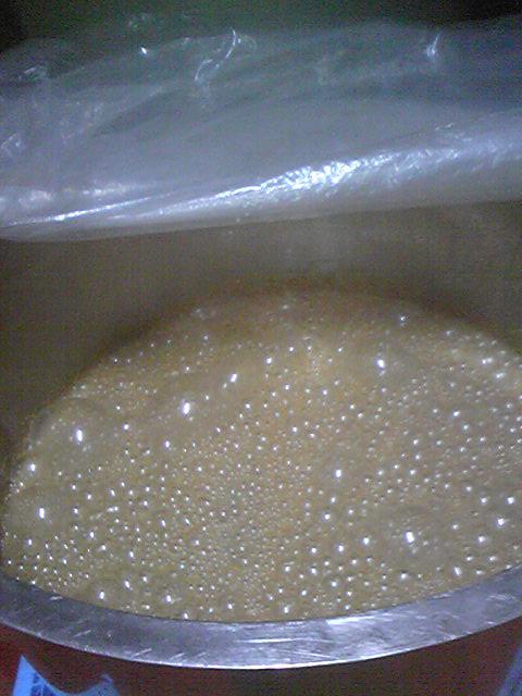 画像は、今日造った酒母。酵母を一日培養させた後、明日澱引きした澄んだ果汁に添加します。