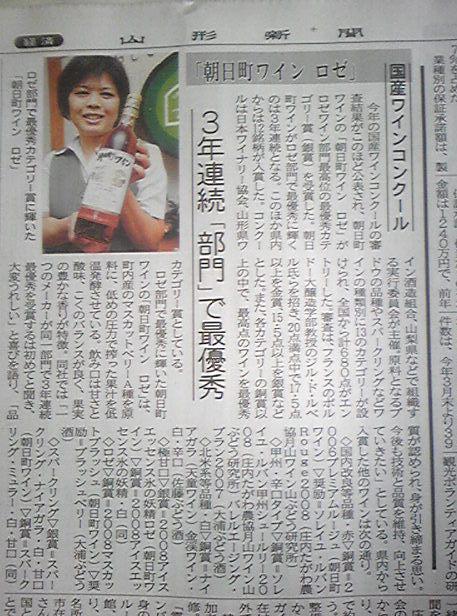 今日の山形新聞朝刊さ、国産ワインコンクール2009の山形県の受賞ワインが載ってるので、読んでおごえ。今年は、朝日町ワインさんの銀賞を筆頭に、県産ワイン12銘柄が入賞しました。