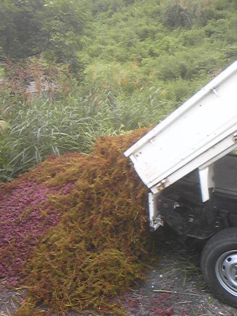 画像は、今日仕込んだデラの搾りかすと茎の部分。プレス機や除梗機から出す毎に、ダンプで畑に捨てに行きます。