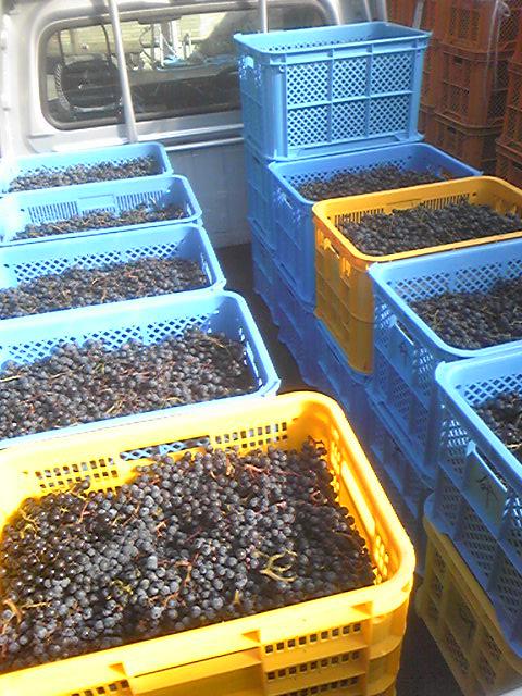 収穫したばっかりの、舟形町産の山葡萄を生産者の方がトラックで今朝おらいさ運んできました。初年度から毎年糖度が上がり、今年のは糖度が19度台\(◎o◎)/ 普通、山葡萄(自生種)だと12度位しか糖度がねぇげんと、舟形の糖度はかなり高くてびっくりしました。んだげんと、酸味もしっかりして。