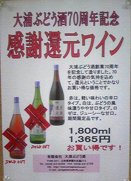おらいの70周年の記念の『感謝還元ワイン』(一升瓶で1,365円!)。お陰様で好評を得て、やや甘口の白と甘口のロゼは完売しましたm(__)m 現在、ライトな辛口の赤のみ販売です。