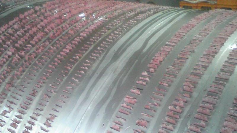 画像は、プレス機のドラム部分。本来ならこの目から果汁がジャーっと出て来るんだげんと、シャーベット状のぶどうが出てきてます。