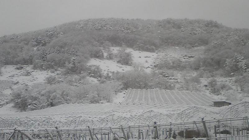 夕方、ワインを取りに松沢の貯蔵庫さ行ったら、すこだま貯蔵庫の前さ雪積もってで、トラックで入らんにぇくて、かなり難儀して、ワインを運んできました。画像は松沢貯蔵庫前の山。秋は、この山いっぱいにぶどうが実りますが、真冬の景色になりました。