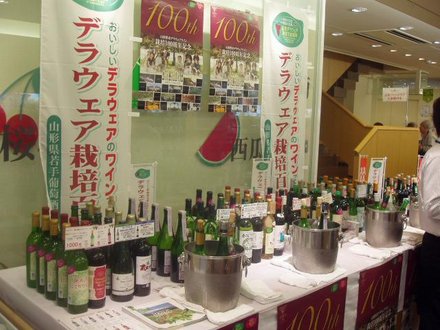 というわけで、銀座にある山形県のアンテナショップで、県内11社のワイナリーの試飲即売会です。各ワイナリーの若手製造者が、山形の歴史ある、そして全国一の生産量を誇るデラウェアーで造ったワインをメインに、日替わり当番制で14日(日)まで販売してます。