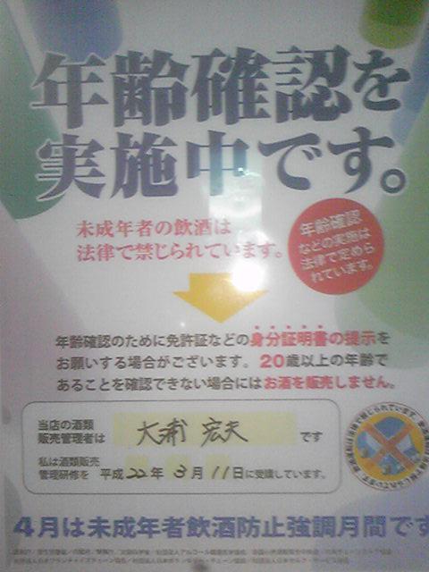 画像は、先日、酒類販売管理者の研修会で配布されたポスターだっし。お酒は20歳になってから、という通り未成年者の飲酒は法律で禁止されてるので、おらいのショップでも、若く見える方には年齢確認を行なって販売してます。