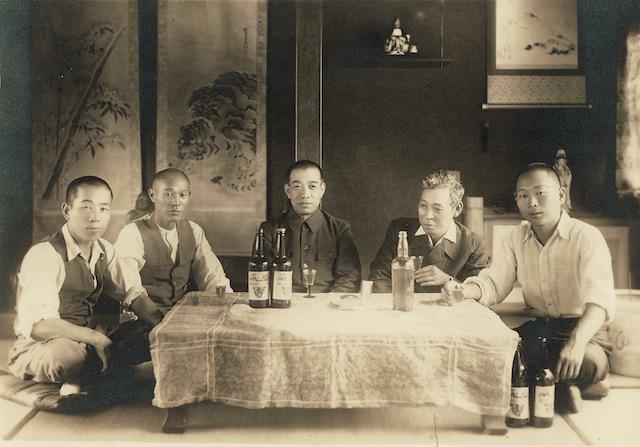 60年くらい前に、おらいでワインを飲んでる貴重な写真だっし(ばあさんのアルバムから発見)。右から二番目の人物が、大浦ぶどう酒創始者のおじんちゃ(ひいじいさん)。当時の町会議員にもなってました。この写真のおじんちゃを見る限り、およそ60年くらい前に撮った写真だと思われます。恐らく、真ん中の方は偉い人で、当時の若い衆(右側の人と左の二人)と一緒に接待しているような感じです。