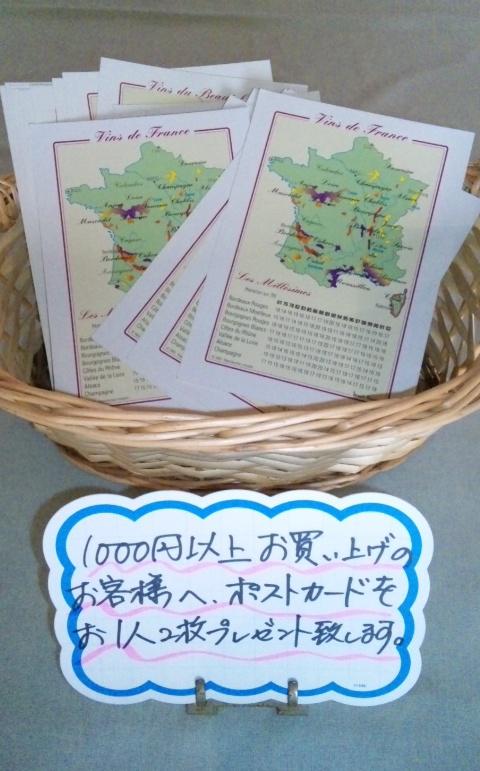 先日、おらいのワインショップで昔使っていたワイン水飴用の瓶ばプレゼントしったっけげんと、早々に無くなりましたので、今回はご来店のお客様で1,000円以上のお買い物の方にフランスのワイン産地が書いてあるポストカードをプレゼント致します(数に限りがあります)。