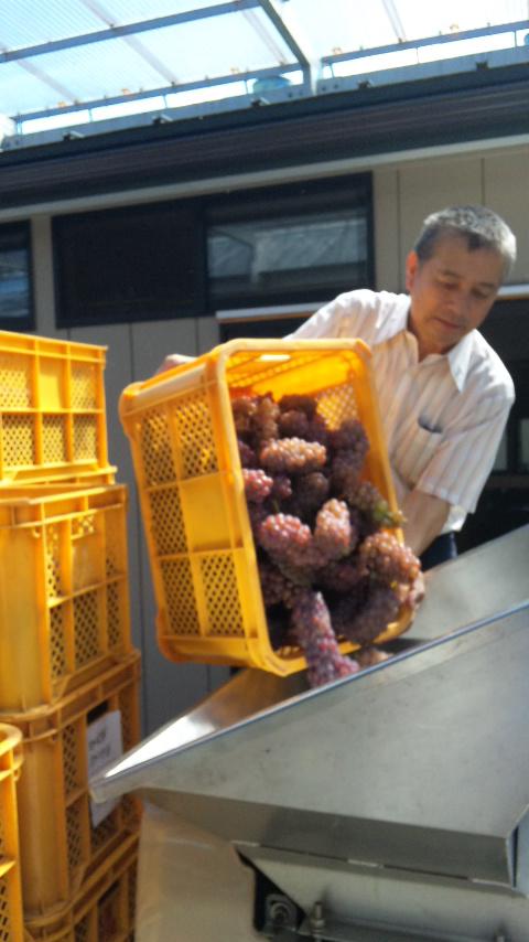 本日より今年のワイン仕込みがいよいよ始まりました。機械にお神酒をお供えし、社員で安全祈願をしてから、デラウェアーを除梗破砕機に社長の第1投(画像)。初球は阪神タイガース藤川球児のような火の玉ストレートが決まり、その後引き続きデラウェアーを潰し約3トンを搾りました。今日のは『赤湯ヌーヴォー(ロゼ)2010』用になります。