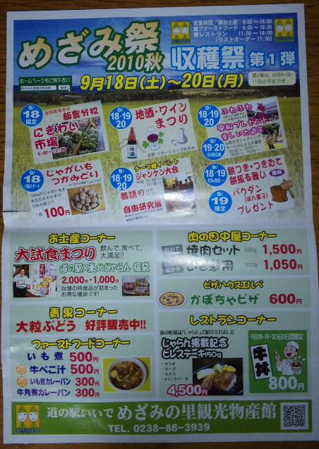 飯豊町めざみの里観光物産館で、18日(土)〜20(月)まで収穫祭が行なわれます。おらいでも、外の特設テント内で試飲即売会をしますので、是非ござっとごぇっし。めざみの里オリジナルの『感謝還元ワイン(白、赤)』も販売致します。大変お得な1,800mlで¥1,470、しかも旨いワインだっし。その他、国産ワインコンクール銅賞受賞の『ブラッシュベリー』も販売致します。