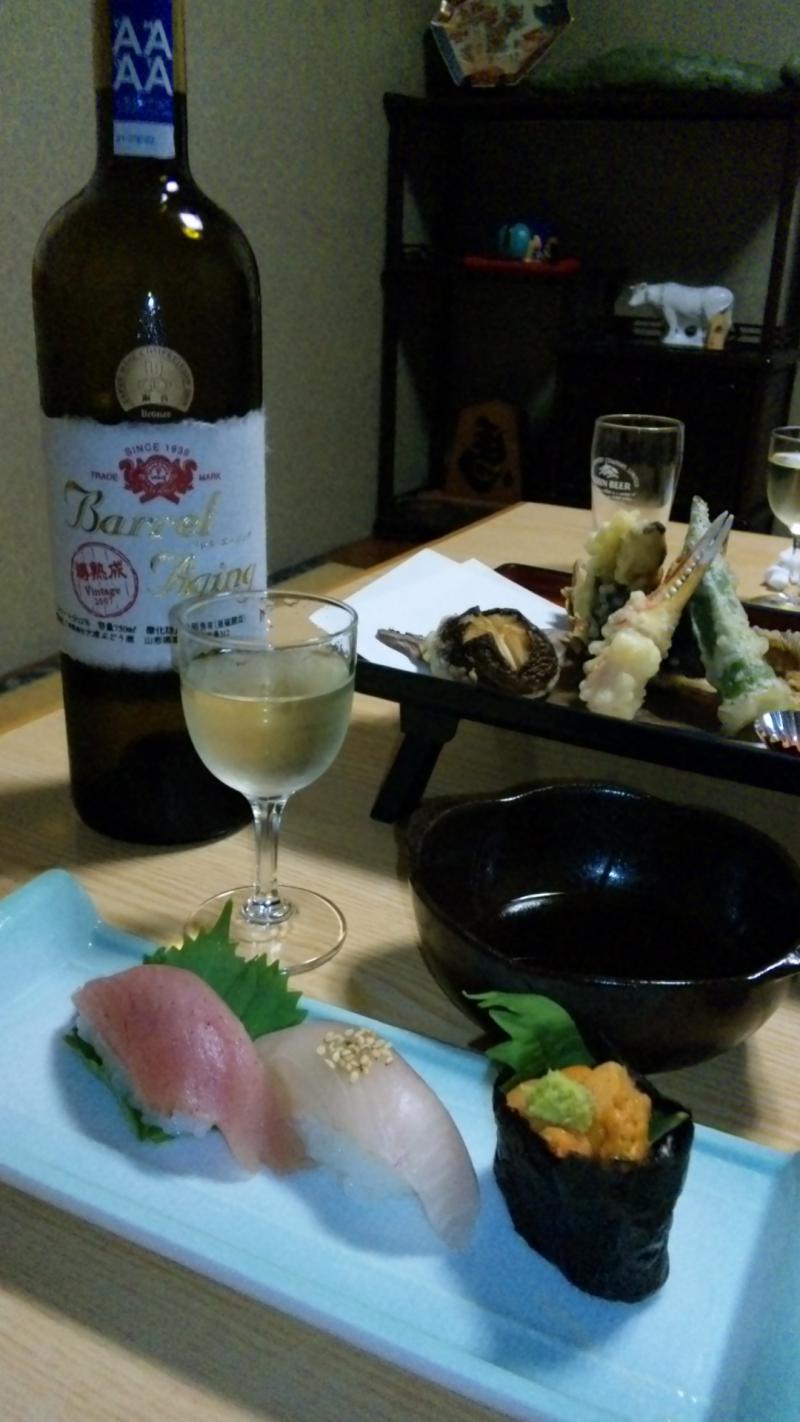 昨日はいつもお世話になっている神戸のお客様が赤湯にお越し頂いたので、夜、利休で、ワインと阪神タイガース談義で飲み、楽しいひと時でした。和食に合わせて、甲州で造った『バレルエージング(ブラン)』と一緒に。