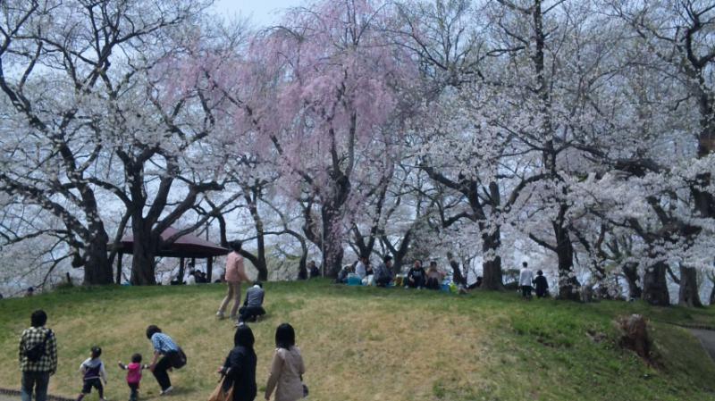 天気が良く、公園の上からは桜と一緒に飯豊連峰もきれい見えました(画像ではいまいち)。