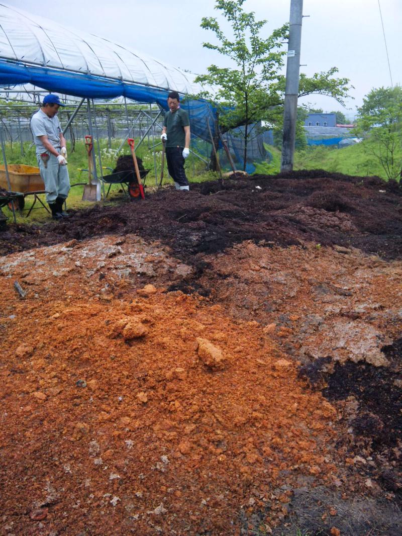 画像はカス投げ場だげんと、奥は夏から秋に搾ったぶどうで、手前の黄色っぽいのが冬場搾ったリンゴの搾りカス。