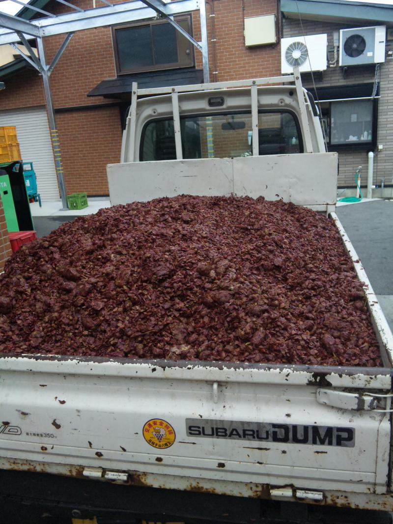 先日1回目の仕込みは『赤湯ヌーヴォー2011』のロゼ用を仕込んだげんと、今日は白用です。約5,500Kgを潰して搾りました。おらいのプレス機はMax3,000Kgまでなので、今日のは2,800Kgずつにして2回仕込みました。画像は1回分の搾りかす。乾燥させて畑の堆肥として、また利用します。