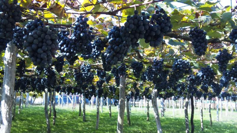 おらいの敷地内にはパレットやトラックに積まれたマスカット・ベリーAが満載。明日は一日で10トン仕込む予定。蜜蜂とかけっこういるので、ご来店の方は注意して下さい。