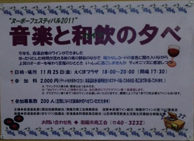 11月25日(金)にえくぼプラザにて、赤湯のワインと音楽を楽しむ『音楽と和飲の夕べ』が今年も行なわれます。たぶん第5回目くらいがな?