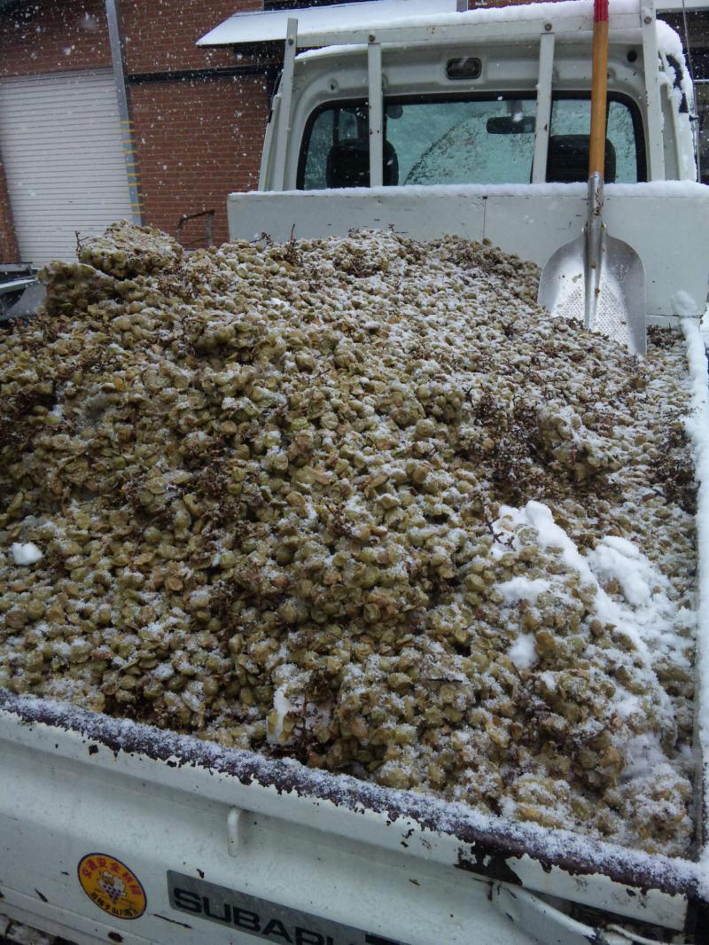 この寒い、そして暮れのかなり忙しい時期に今年最後のワイン仕込みをしました。凍ったナイアガラで、今年国産ワインコンクールで銅賞受賞した『アイススウィートナイアガラ』を造ります。昨日搾ってる時は雪も降んねくて良かったげんと、今日搾りカスをプレス機から出したり、プレス機を洗ってる時は吹雪でよぉ。いやー寒がった。