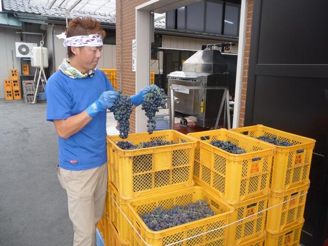晴天に恵まれ今日はワイン仕込み日和でした。今年2回目のブラック・クィーンという品種で、約4トン半を除梗破砕機へ入れ、実を潰してタンクへ送りました。このブラック・クィーンの茎はかなり長いので、除梗機のプロペラさ絡まり易くて、去年はかなり難儀して仕込んだげんと、今年は昨年の教訓を活かして途中で機械を止めることなく無事終了。