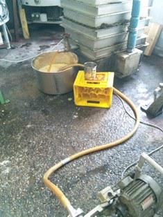 さて今、冬場ということでぶどうでなく、リンゴでのワイン仕込みを行ってます。白ワインと同じく、実を破砕してから搾り果汁にしたものへ酵母を入れ発酵させます。今日発酵3日目をむかえったげんと順調に進んでます。