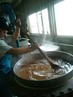 おらいで昔から造っている『シャルマンぶどう液』。ぶどう果汁20%入りの清涼飲料水です。明日瓶詰め予定なのでその準備を。おっきな釜で糖類と酸味料を溶かして一日冷ましてから、ぶどう原液と香料を加えて造ります。