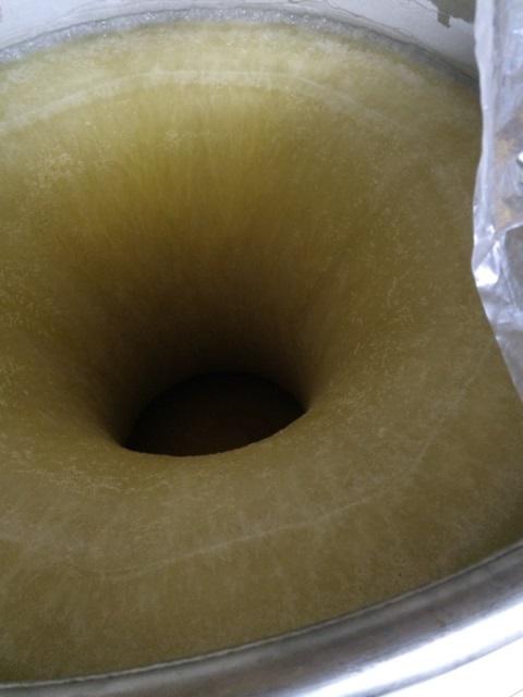 約2週間ちょい凍らせたナイアガラの果汁を、中心部分の凍ってない非常に濃度の高い部分をポンプで吸い取り、別の発酵タンクへ移しました。15度位の糖度が40度近くまで上昇。極甘口の『アイススウィートナイアガラ』を造る準備中です。