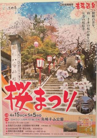今年の赤湯温泉桜まつりは4月15日(金)〜5月5日(木)までです。ポスターを頂きました。毎年見頃が微妙に違いますが、今年は暖冬の影響でどうなっぺ?